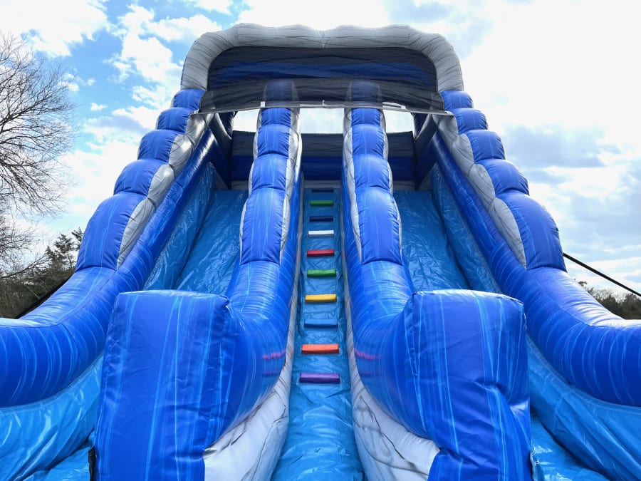 Surf down the 20' tall Rockin' Wave Dual Lane Water Slide and cool off this Summer while you have a great time racing with your guests in this 2 lane exciting slide. Riders climb up to the top, pick from one of the 2 lanes, slide down under the water misting system and splash into the pool. Great for recommended ages 8 and up to adults. This 20' dual lane slide can be used indoors as a dry slide as well in the colder months.