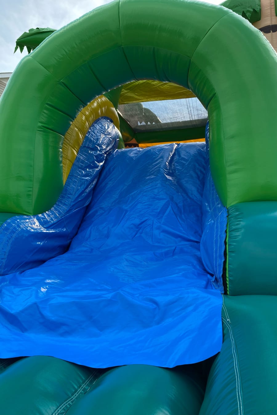 Make your next event a Tropical paradise for children with the addition of the Tropical Escape Combo inflatable. The design is quite eye catching, with its bright tropical colors and life-like palm trees. Our Tropical Escape wet/dry combo bouncer is the perfect inflatable for any season or event including Hawaiian, safari or summer theme parties. This 4-in-1 bounce house/slide combo features a large bouncing area, climbing wall, basketball hoop, and slide which can be used as a dry slide in the cooler months and as a water slide on hotter days.