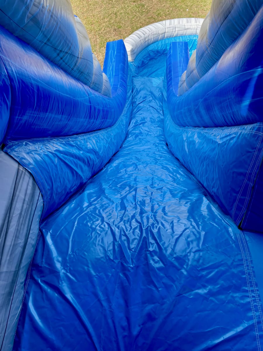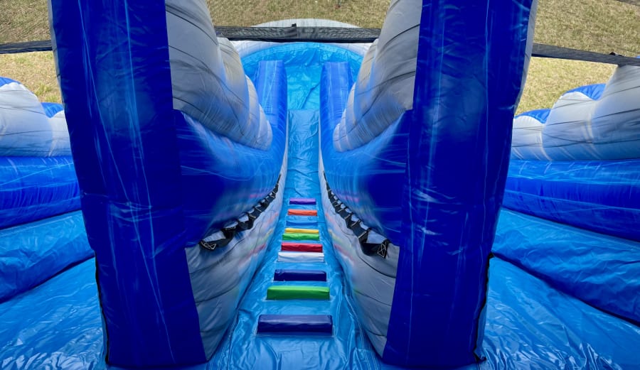 Surf down the 20' tall Rockin' Wave Dual Lane Water Slide and cool off this Summer while you have a great time racing with your guests in this 2 lane exciting slide. Riders climb up to the top, pick from one of the 2 lanes, slide down under the water misting system and splash into the pool. Great for recommended ages 8 and up to adults. This 20' dual lane slide can be used indoors as a dry slide as well in the colder months.